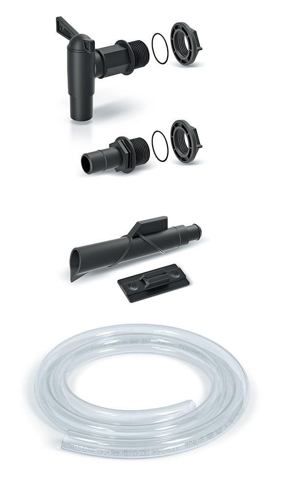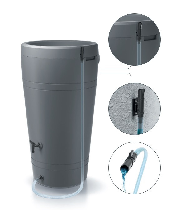 A hordóhoz egy átlátszó kerti tömlő is csatlakoztatható. A csomagban minden olyan alkatrészt megtalál, amely a tömlő felszereléséhez fontos. Még egy